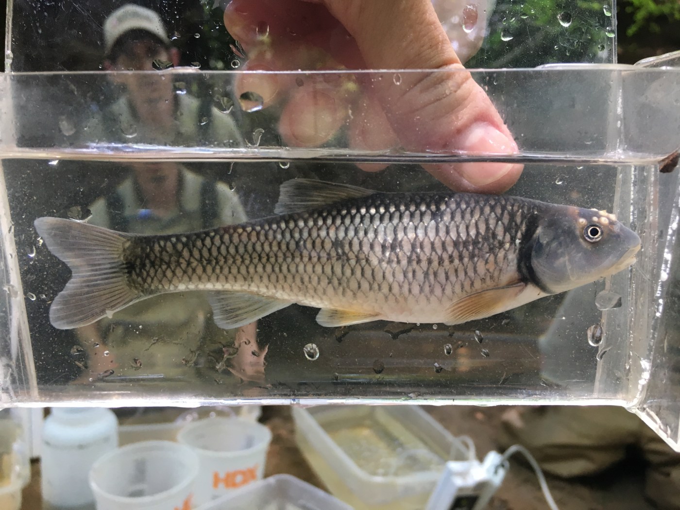 Bluehead Chubs’ heads swell up during spawning season and their tubercles are on the larger side. These are for show: to impress the ladies and scare off other males. This species of freshwater fish is a hopeless romantic. Bluehead Chubs build nests then guard them to impress the females. The most fascinating part is that the nests are built from gravel that the males pick up and carry in their mouths. But not only is that cool, Blueheads will go out of their way to find every last piece of gravel in a creek if there isn’t an abundance of that substrate. These gravel mounds are clearly visible from outside the stream and are also utilized by another species, the Yellowfin Shiner (Notropis lutipinnis). These two species have a symbiotic relationship over the mound: the Blueheads tend to the nest and keep it free from silt, while the Yellowfin Shiners use it for spawning as well. This is a mutualistic relationship because the Yellowfin Shiners get egg protection from the Blueheads, while the addition of more eggs in the nest decreases the probability of your offspring being predated.