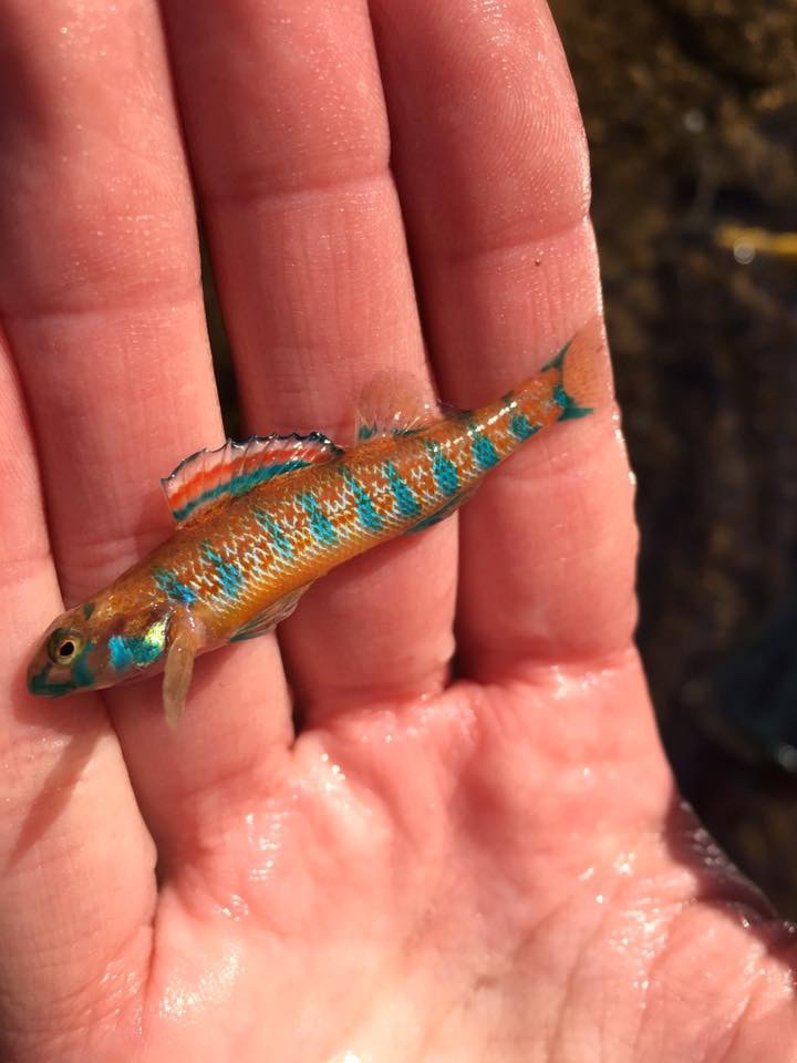 This wasn’t a piece of trash at all, it was a beautiful colored up male Speckled Darter (Etheostoma stigmaeum). He was so brightly colored, that I thought he fake – a piece of trash even – but no, he is so much more than that! As I picked him up to examine him in awe, I realized I had a newfound love: freshwater fishes. Not only was this moment amazing because I got to see one first hand, but it turns out that their population in that creek has been declining over the years and we were lucky to even see one.